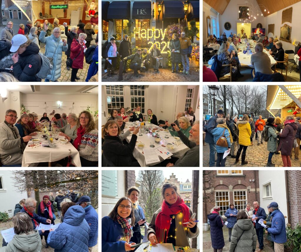 Op maandag 16 december genoten 70 enthousiaste OOPOEH’s van een winterse puzzelwandeling door de prachtige verlichte Amsterdamse Jordaan. Onder leiding van de gidsen van onze lieve buren van het Gilde Amsterdam ontdekten we al puzzelend de historische pareltjes van Amsterdam. Na de wandeling stond er een lekker warme snertmaaltijd klaar in de prachtige regentenkamer van ons mooie hofje, die speciaal voor ons feest ter beschikking is gesteld door het RCOAK We haalden alles wat glitterde uit de kast voor een heel geslaagd OOPOEH-kerstfeest!