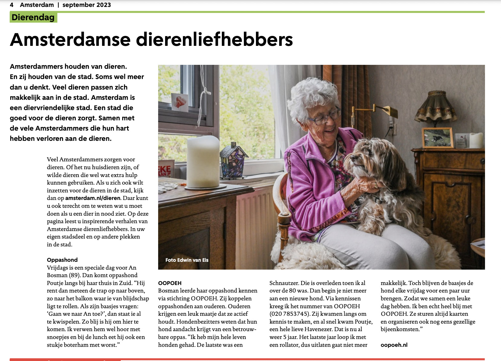 OOPOEH An (89) past al jaren met met veel liefde en plezier op hondje Poutje. In september was deze mooie match te zien in de stadskrant van de gemeente Amsterdam (stadszeel Zuid). We hopen op veel nieuwe Amsterdamse OOPOEH’s door dit leuke artikel.