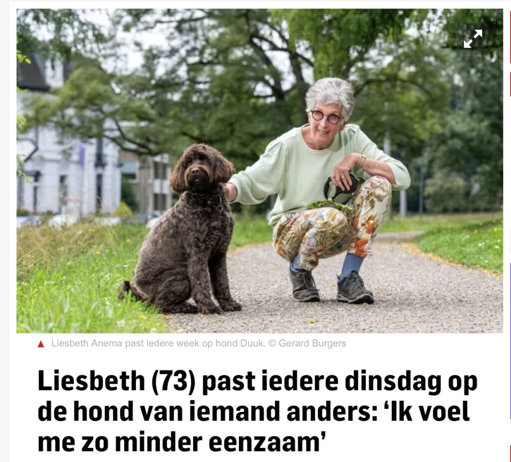 Een hele pagina in de Gelderlander (omg. Arnhem) over OOPOEH Liesbeth en haar lieve oppashond Duuk, wat een eer! Liesbeth (73) past al 7 jaar elke dinsdag op Duuk en vertelt daar heel enthousiast over. We zijn erg blij met deze mooie media-aandacht.