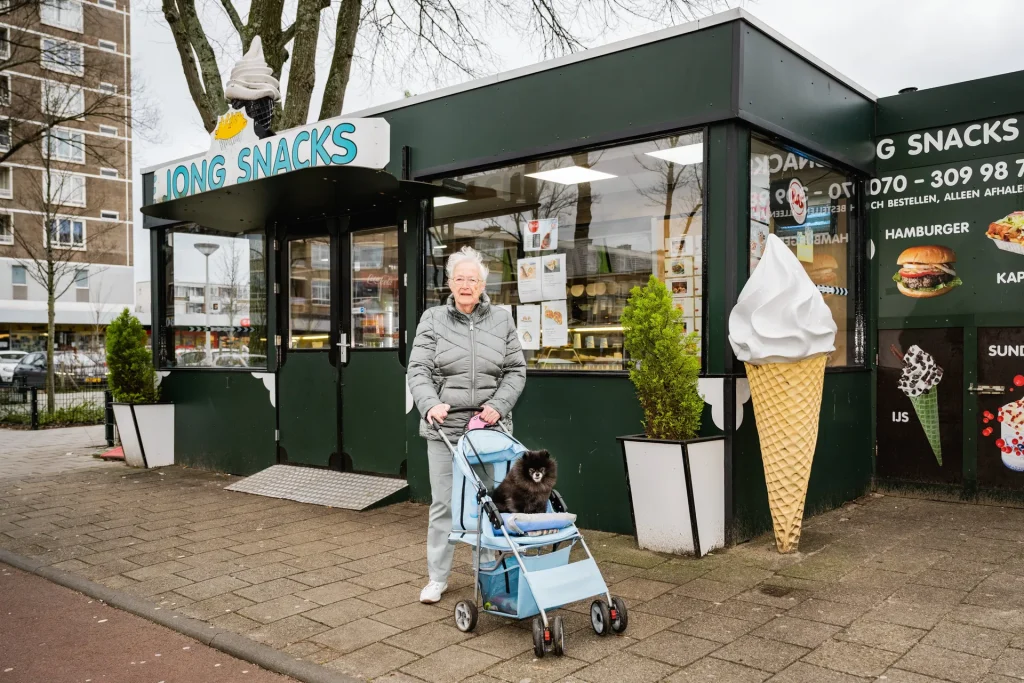 Drie dagen in de week spendeert Mia bij Van Ravens, die boven een winkelcentrum in Den Haag woont. Een betere match is er niet. Mia is een aparte, zegt Van Ravens liefkozend met het hondje op haar schoot. Ze is heel klein. „Zie je mij al met een grote hond rondzeulen?” Ze blaft niet. „Ik heb een hekel aan geblaf.” En ze is een enorme treuzelaar die zich vaak op de grond laat vallen. „Dan kan je er een lontje in steken, maar die staat niet meer op.” Ideaal, vindt Van Ravens. Samen doen ze het lekker rustig aan.