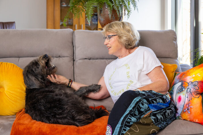 Jetty (71) woont al 30 jaar met plezier in Almere en is haar hele leven al een enorme dierenliefhebber. 35 jaar woonde ze samen met haar lieve katten. Het liefst had ze ook honden genomen maar ze woonde alleen en met een drukke baan was dat niet te combineren. Bij de Albert Heijn werkte ze, op de administratie. Met plezier kijkt ze terug op haar lange loopbaan daar. Op haar 66ste ging ze met pensioen en sindsdien vult Jetty haar dagen met de leuke dingen van het leven. Ze is druk met allerlei kunstzinnige hobby’s en daarnaast is ze een fervent wandelaar en fietser. Ook kwam de lang gekoesterde wens, een eigen hondje, weer bovendrijven. Ze overwoog zelfs om een hondje uit het asiel te halen maar ze twijfelde; ze zou het vreselijk vinden als het hondje haar zou overleven.