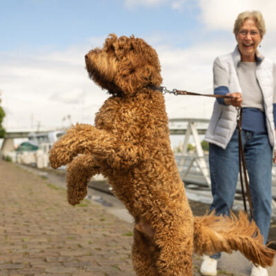 Met Boumy op de achterbank toert Moniek regelmatig naar bijvoorbeeld het Eiland van Brienenoord, de Esch of naar de Hoeksche Waard. Of ze gaat met Boumy in de metro of de tram. Alle losloopplekken zijn inmiddels door het tweetal bezocht. De energieke Labradoodle kan dan even uitrazen en heerlijk spelen met andere hondjes. Moniek: ‘Ik vind dat een feest om naar te kijken. En ik klets ondertussen gezellig met wat hondenbaasjes.’