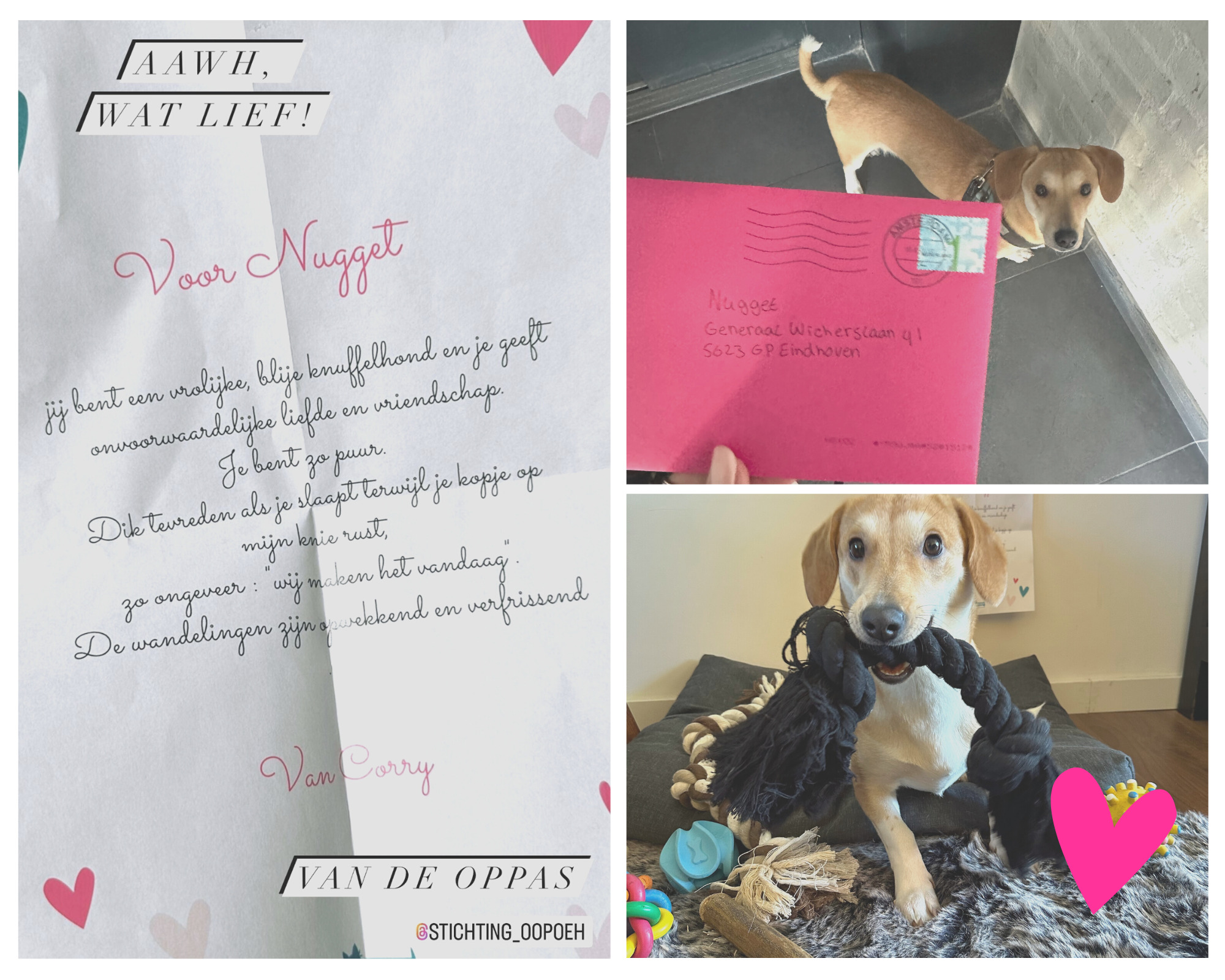 Nugget is een van de véle hondjes die vandaag een Valentijnsgedicht ontving van z’n OOPOEH. Bovenverwachting veel OOPOEH’s klommen in de pen om het mooiste Valentijnsgedicht te schrijven aan hun dierbare oppashond en we waren heel erg onder de indruk van al die lieve/grappige/originele/mooie en bovenal hartverwarmende berichten. Iedereen heel veel dank voor het meedoen en een HAPPY VALENTINE!